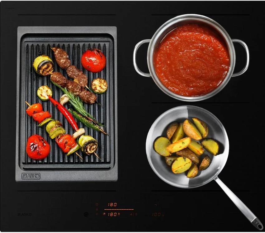 Обычно объединяются две конфорки — как правило, передняя и задняя в одном ряду, — но в больших варочных панелях может предусматриваться объединение трех и даже четырех зон нагрева. Активировать эту функцию рекомендуется, если планируете использовать посуду нестандартной формы и большого размера — жаровни, утятницы, казана, прямоугольной сковороды-гриль. Иногда на такую объединенную зону можно поставить несколько небольших порционных сковородок или кастрюль. Это особенно удобно, так как общая зона имеет единое управление: при приготовлении можно регулировать интенсивность нагрева для нескольких блюд одним движением.