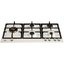 Варочная панель в дизайне слоновой кости с фурнитурой в цвете «хром». На поверхности расположено 5 латунных конфорок разного диаметра. Крупная конфорка WOK находится слева, может набирать мощность до 5 кВт. Ручка управления этой зоной расположена отдельно. Поворотные переключатели установлены на фронтальном крае, вы можете включать газ одним нажатием благодаря функции автоподжига.