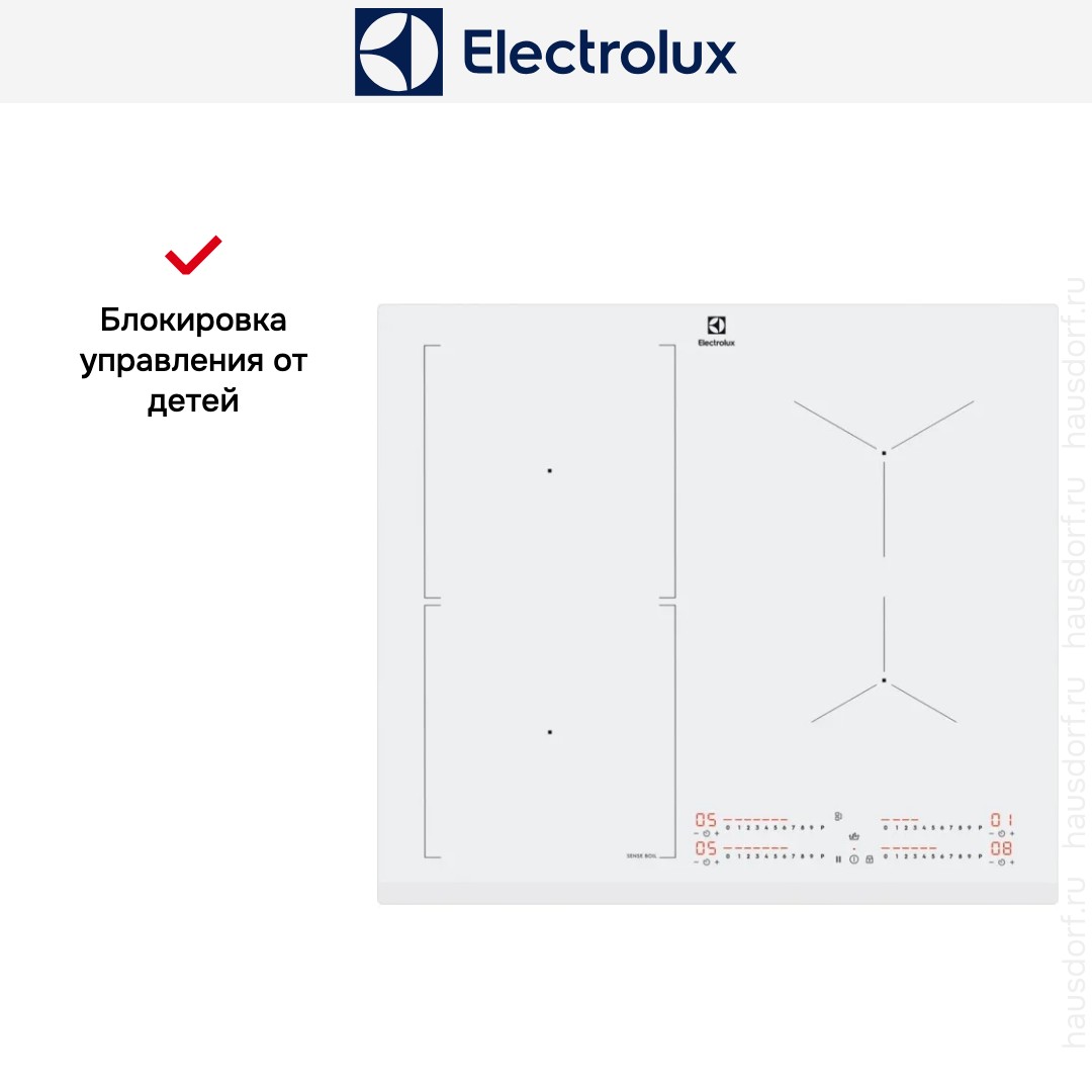 Таймер с отключением в конце приготовления в электрических варочных панелях Electrolux предназначается для безопасной, удобной и экономичной готовки. Длительность приготовления задается при помощи кнопок сенсорного меню для каждой зоны нагрева: о том, что блюдо готово, оповещает звуковой сигнал.