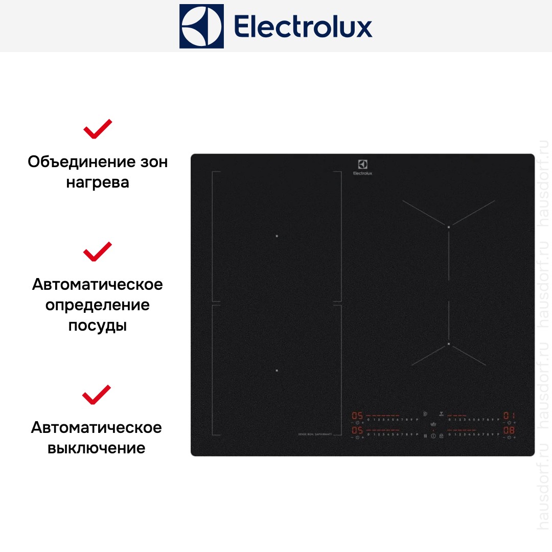 Объединение зон нагрева в индукционных варочных панелях Electrolux позволит создать из двух соседних конфорок одну общую с единым управлением. При этом можно использовать посуду любого вида и формы с автоматической подстройкой под ее размер, меняя температуру и время приготовления одним движением.