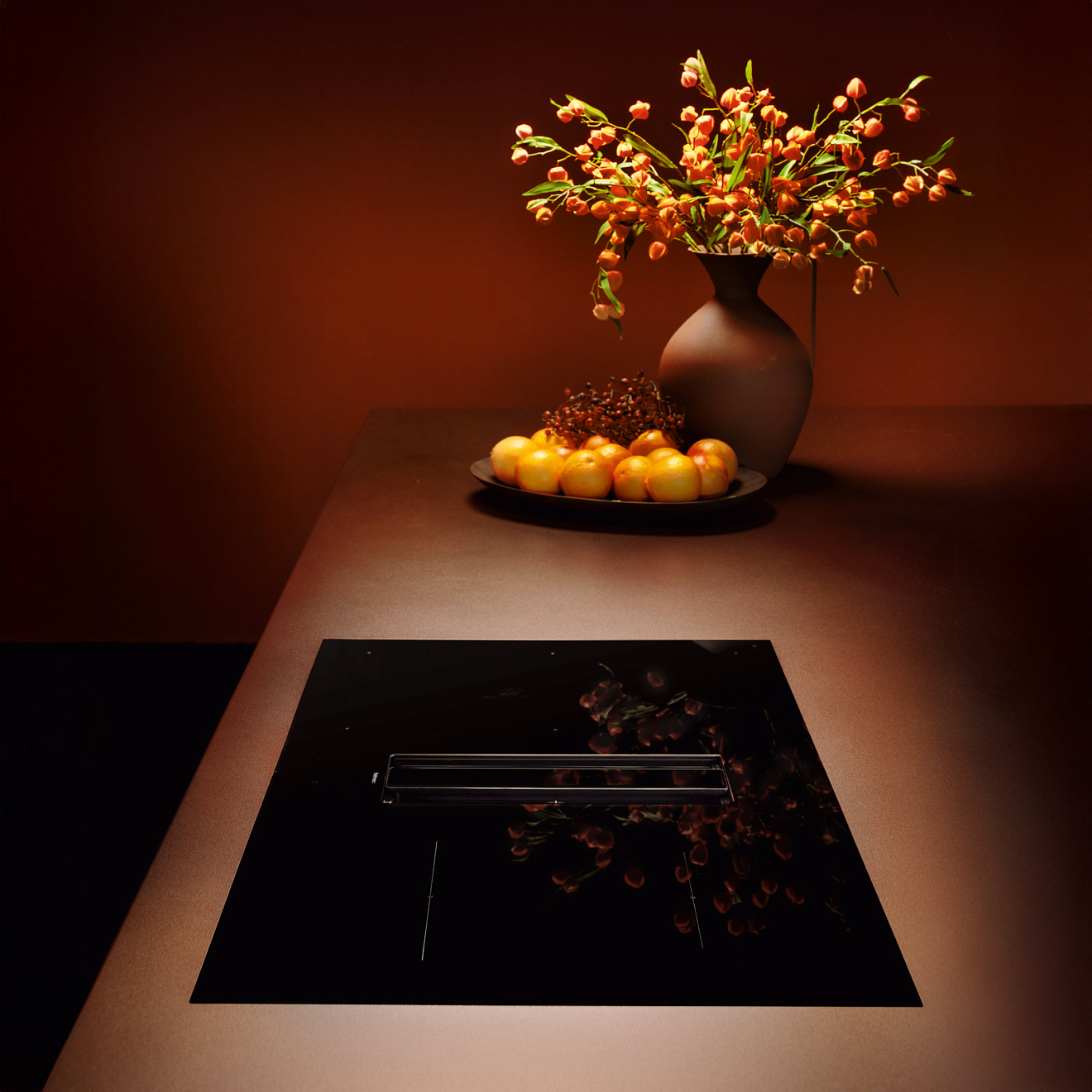 Вытяжка, встроенная в варочную панель — достаточно удобный вариант, позволяющий сэкономить место в кухне. Такая конструкция позволяет лучше улавливать испарения, не давая им распространяться по всему помещению, и способствует более качественной очистке воздуха. Большинство подобных моделей может работать только в режиме рециркуляции воздуха, с удалением капель жира, сажи, неприятных запахов при помощи системы фильтров. Работу в режиме отвода загрязненного воздуха через систему вентиляции организовать довольно сложно, поскольку вытяжка располагается низко над полом. Часто варочная панель находится на кухонном острове, что также мешает присоединению к вентиляции. Еще одна особенность подобных моделей состоит в том, что под варочной панелью нельзя разместить духовку или другую технику, так как место будет занято.