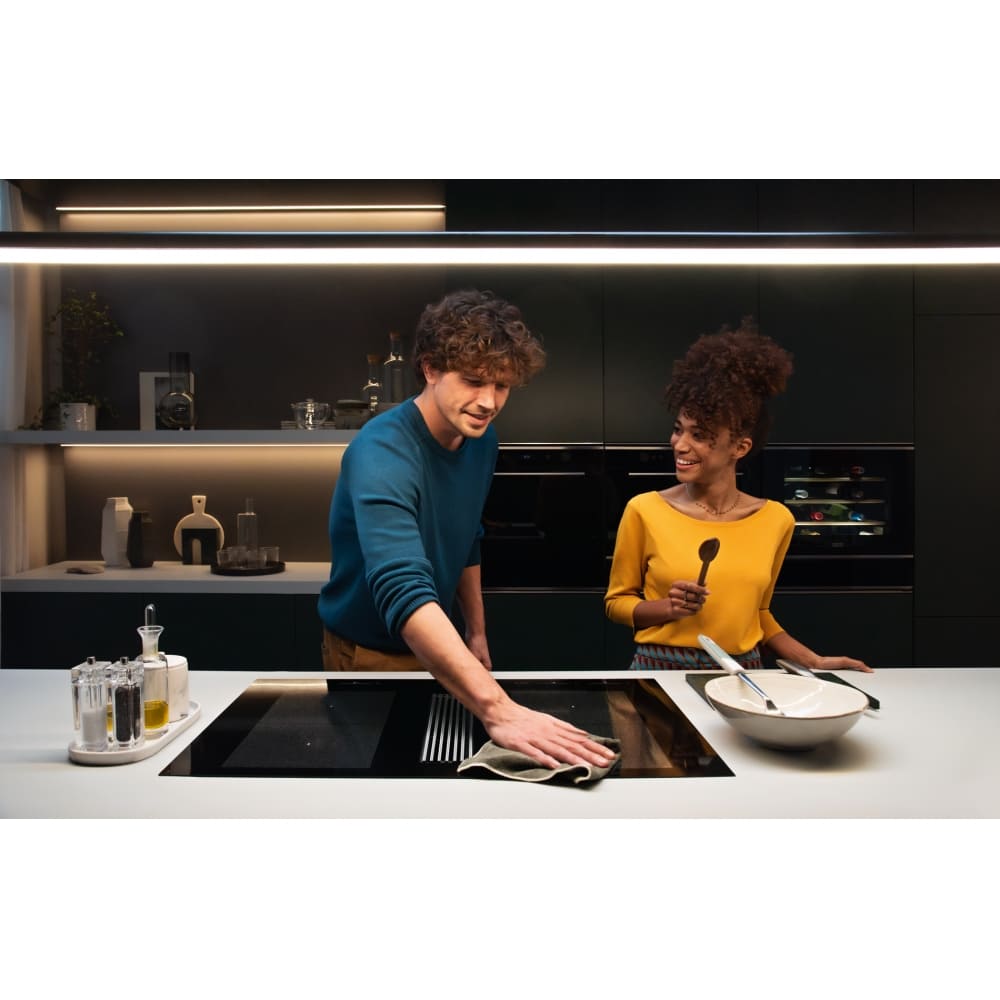Выглядит сдержанно и монолитно: стеклянная рабочая поверхность черного цвета с прямым краем и стилистикой Mythos. Ширина 83 см и толщина корпуса создают впечатление компактного модуля, который устанавливается накладным способом и аккуратно занимает нишу 75×49 см. Фронтальное расположение элементов управления делает доступ к сенсорному слайдеру максимально удобным в повседневной готовке.