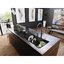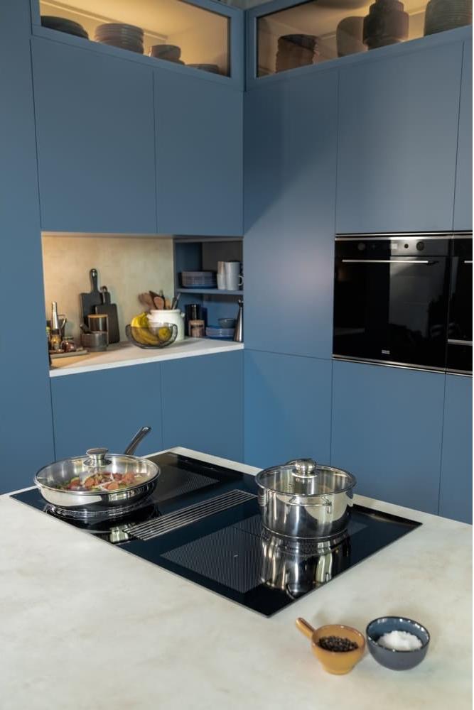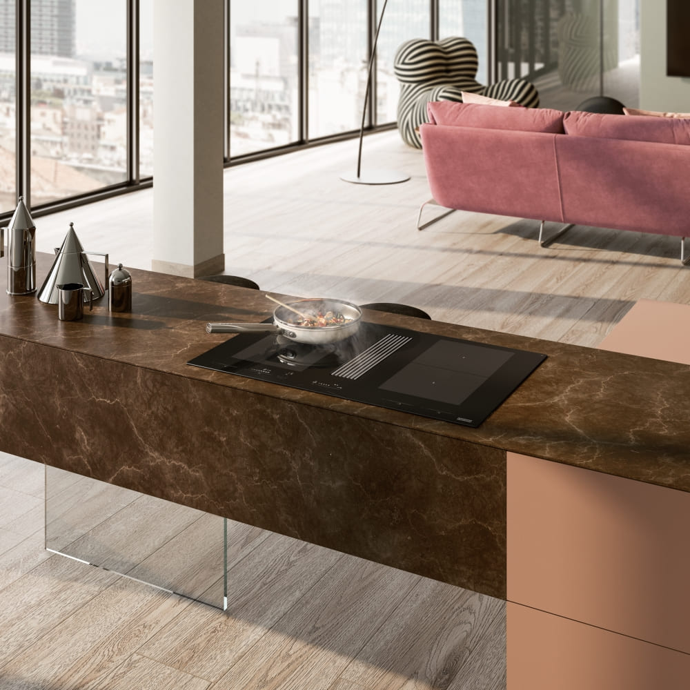 Вытяжка, встроенная в варочную панель — достаточно удобный вариант, позволяющий сэкономить место в кухне. Такая конструкция позволяет лучше улавливать испарения, не давая им распространяться по всему помещению, и способствует более качественной очистке воздуха. Большинство подобных моделей может работать только в режиме рециркуляции воздуха, с удалением капель жира, сажи, неприятных запахов при помощи системы фильтров. Работу в режиме отвода загрязненного воздуха через систему вентиляции организовать довольно сложно, поскольку вытяжка располагается низко над полом. Часто варочная панель находится на кухонном острове, что также мешает присоединению к вентиляции. Еще одна особенность подобных моделей состоит в том, что под варочной панелью нельзя разместить духовку или другую технику, так как место будет занято.
