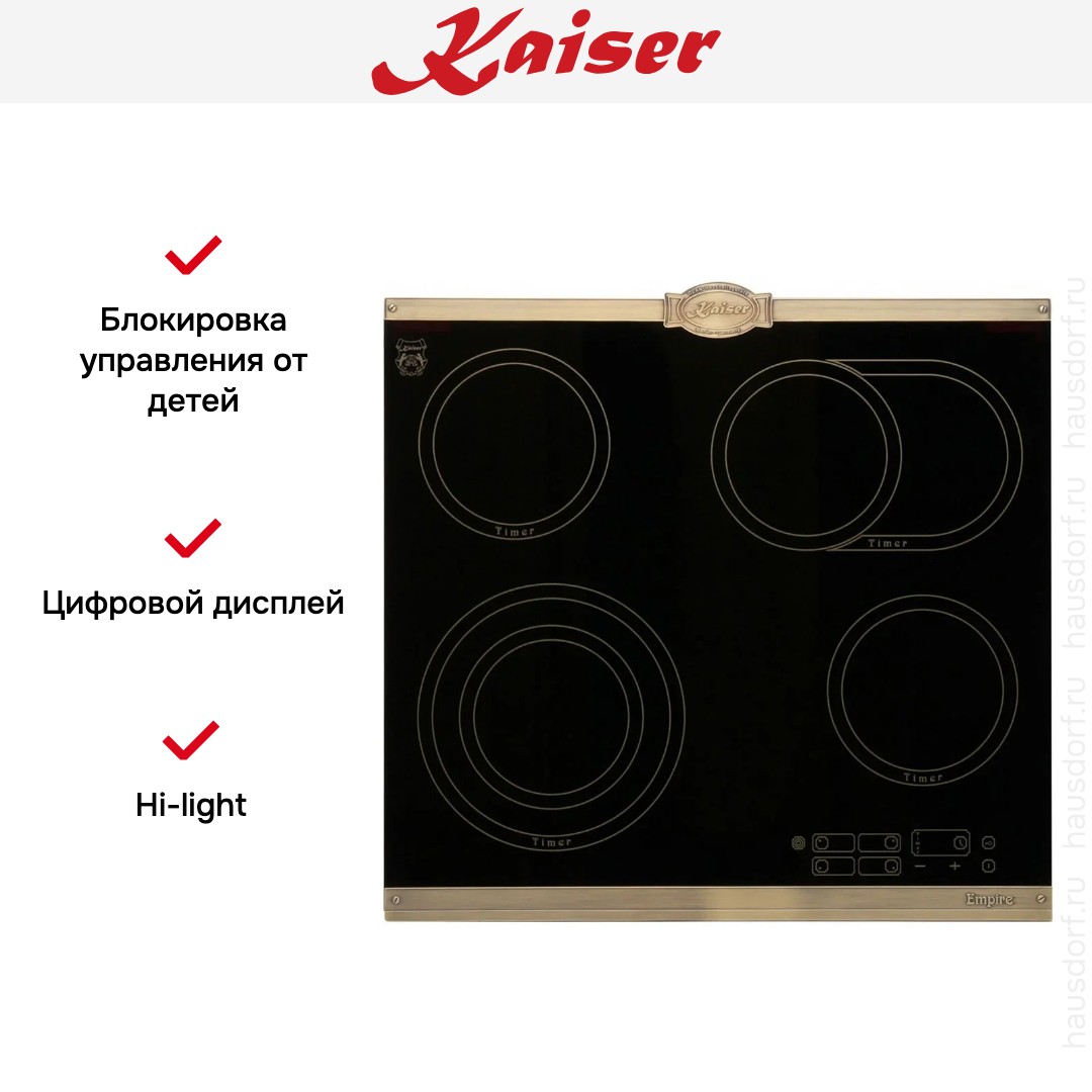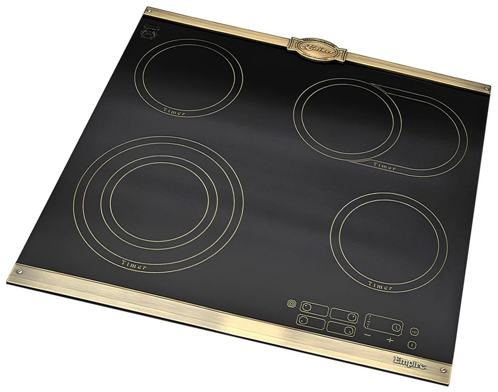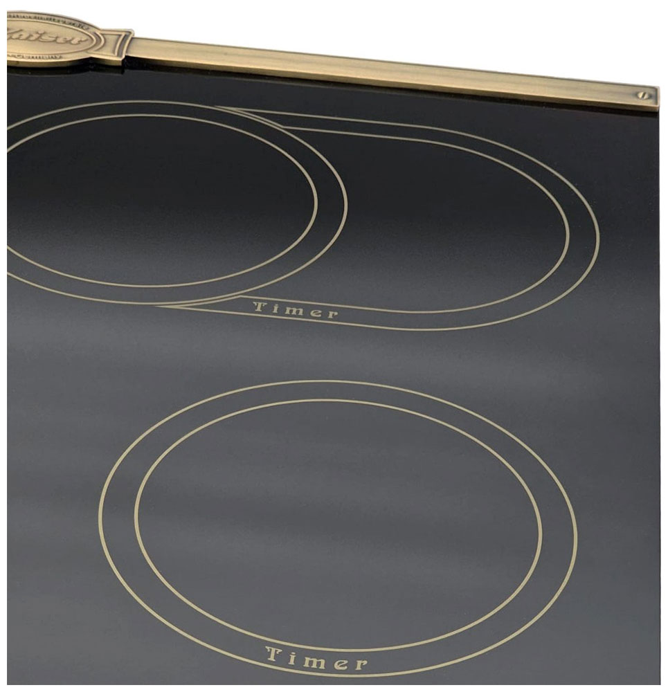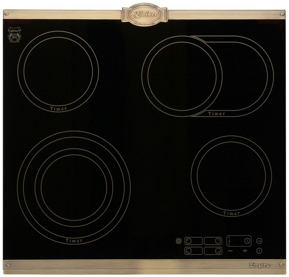 Варочная панель Kaiser KCT 6185 Em — элегантный прибор в стиле Empire, который гармонично сочетает черную стеклокерамику и бронзовую металлическую рамку. Внешний вид выполнен с акцентом на сдержанную роскошь, что делает изделие центральным элементом кухни и одновременно не перегружает интерьер. Высота всего 4,3 см придает поверхности легкость, а качественная обработка края обеспечивает аккуратный стык со столешницей. Материалы подобраны так, чтобы сохранить презентабельный вид при регулярной эксплуатации и упростить уход за плитой.