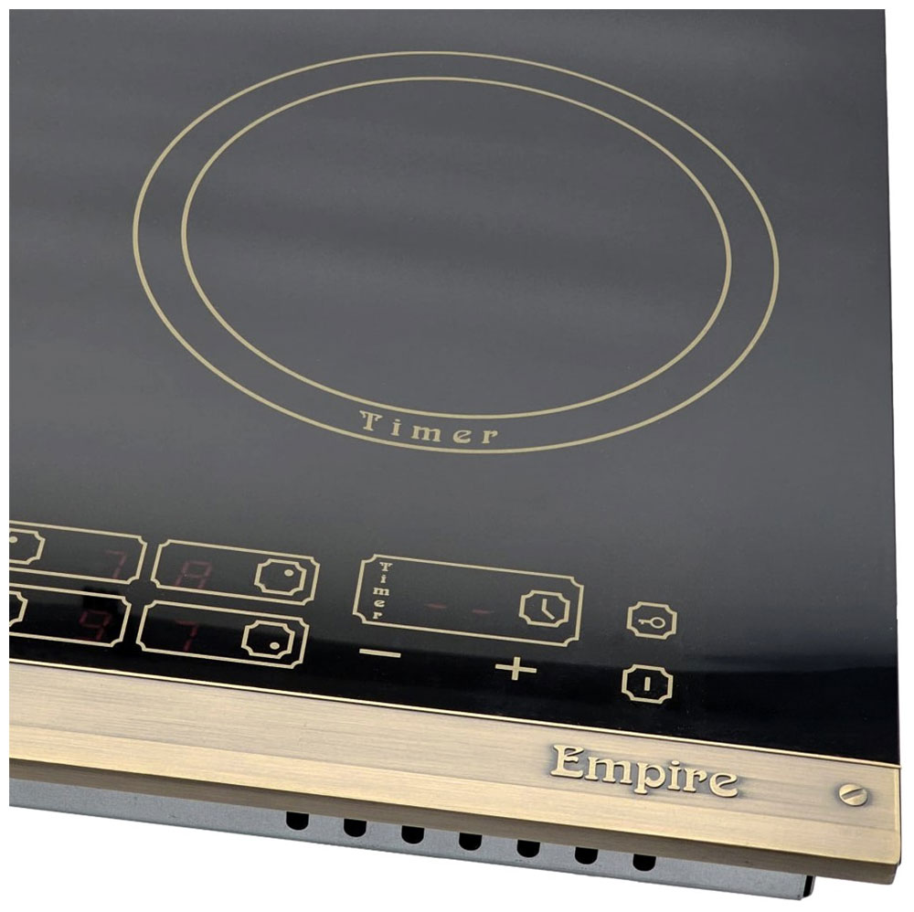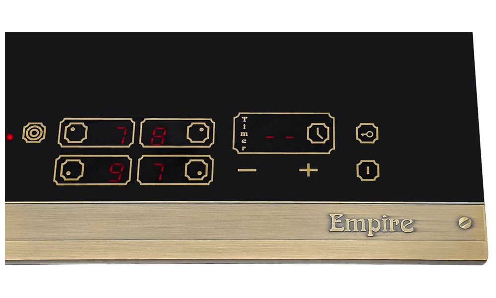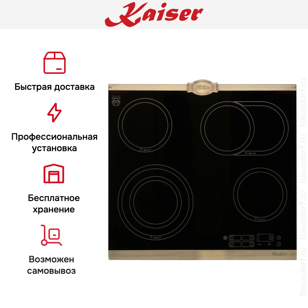 Варочная панель Kaiser KCT 6185 Em — элегантный прибор в стиле Empire, который гармонично сочетает черную стеклокерамику и бронзовую металлическую рамку. Внешний вид выполнен с акцентом на сдержанную роскошь, что делает изделие центральным элементом кухни и одновременно не перегружает интерьер. Высота всего 4,3 см придает поверхности легкость, а качественная обработка края обеспечивает аккуратный стык со столешницей. Материалы подобраны так, чтобы сохранить презентабельный вид при регулярной эксплуатации и упростить уход за плитой.