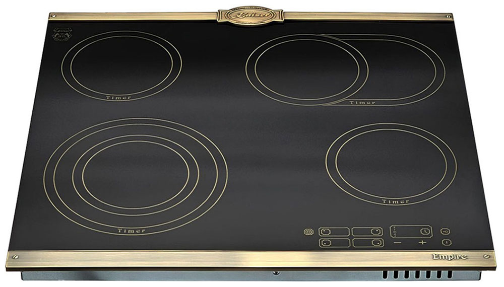 Для варочных панелей в стиле кантри, ампир или классическом характерны латунные ручки из сплава меди и цинка, которые смотрятся благородно и выигрышно. Реже производятся модели, имеющие золотистую или медную фурнитуру.