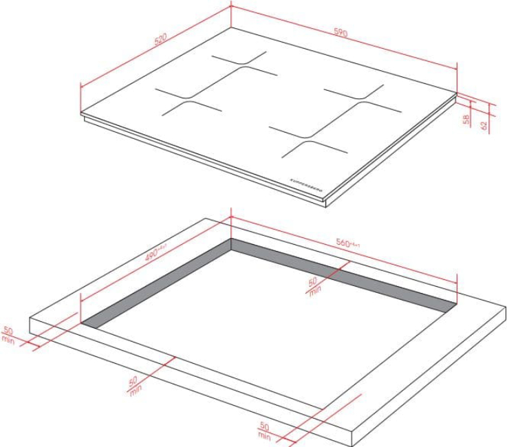 Отверстие в нише выполняют, исходя из размеров самой варочной панели — они должны соответствовать друг другу либо немного превышать размеры выреза. При выборе наиболее распространенной варочной панели с 4 конфорками в столешнице вырезается отверстие шириной 59 см и глубиной около 49-50 см. Толщина столешницы должна быть немного меньше, чем высота варочной панели, в противном случае панель придется заглубить, чтобы она не слишком выступала.