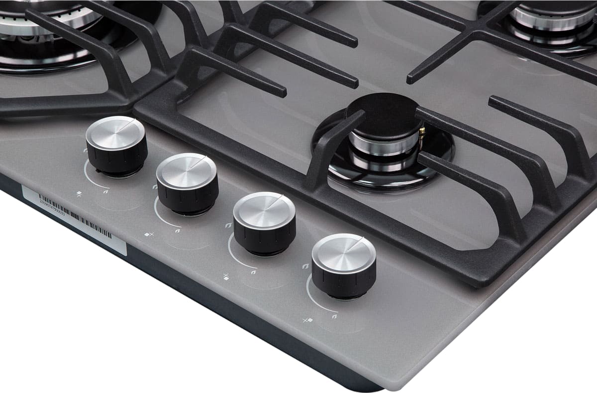 Выбор газовой варочной панели чаще всего обусловлен тем, что в частный дом или квартиру проведен именно газ в качестве обогрева. Работать с этой моделью довольно просто, так как мощность нагрева видна невооруженным взглядом — по силе огня в горелке. Количество конфорок в этой модели: 4. Горелки с двойной короной позволяют увеличивать мощность нагрева в зависимости от диаметра посуды.