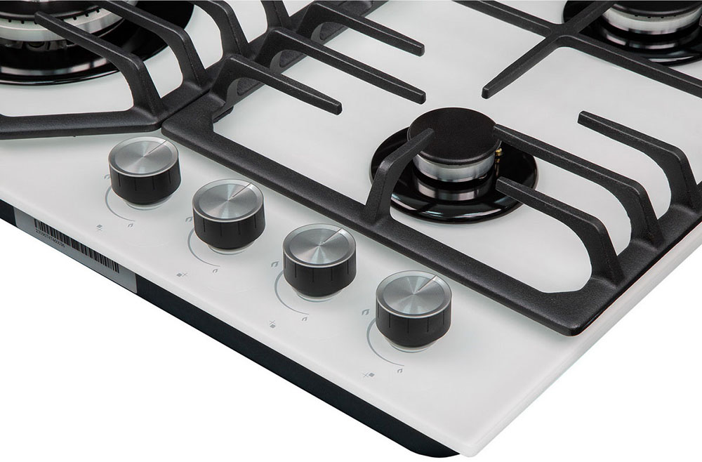 Цвет — белый. Благодаря отсутствию рамки она отлично впишется в интерьер и не займет лишнее место на столешнице, которое можно использовать для работы. Открытый огонь не страшен ни вашей посуде, ни вам, так как горелки надежно закрыты решетками. Материал самой поверхности: закаленное стекло. Управление этой моделью механическое. Для переключения уровней нагрева, выбора функций используются следующие переключатели: поворотные. Простая система контроля за прибором делают его более универсальным, ведь разобраться сможет кто угодно.