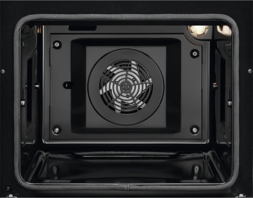 Недостаток этого режима — поджаривание только сверху: естественная конвекция препятствует распространению горячего воздуха в нижней части камеры. Вентилятор, размещенный на задней стенке духовки, решает эту проблему: благодаря принудительной конвекции нагретый воздух распределяется более равномерно, и блюдо запекается со всех сторон. Этот режим поможет приготовить целиком сочную индейку, гуся, поросенка и другие продукты сложной формы, причем переворачивать их вам не придется.