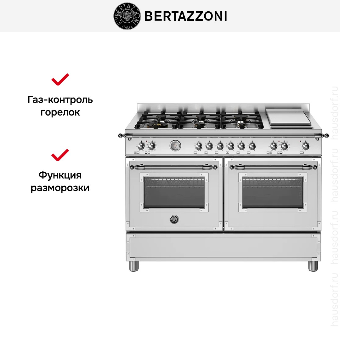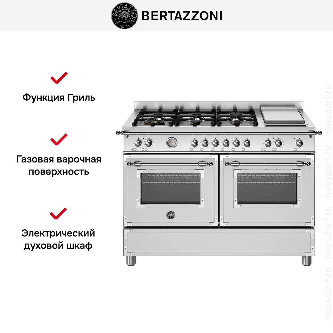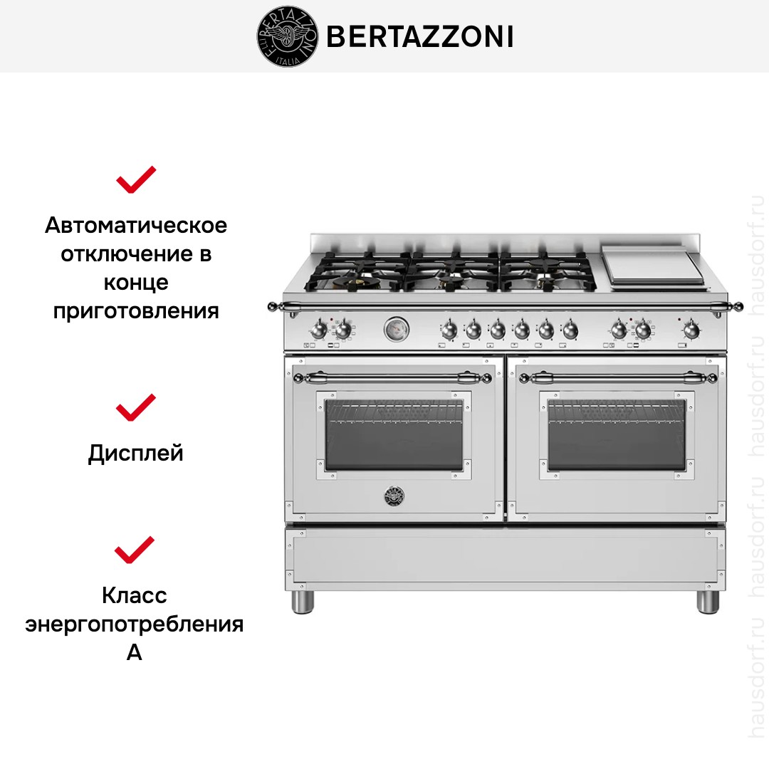 Варочный центр Бертаззони оборудован несколькими духовками; одну из них можно использовать как основную на постоянной основе, другие как дополнительные. Тип нагрева в камере — электрический. Большое внутреннее пространство позволяет готовить сразу несколько блюд или целиком запекать птицу, использовать объемную посуду. Вместимость составляет 138 л. Размещайте противни на разной высоте в зависимости от режима или желаемого результата. Основные функции, которые уже заложены производителем: Освещение, Верхний и нижний нагрев, Гриль + конвекция, Нижний нагрев, Горячий воздух, Размораживание, Конвекция, Быстрый разогрев, Верхний нагрев.