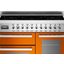 Bertazzoni PRO1005IMFTO — отдельно стоящий варочный центр шириной 100 см, выполненный в ярких оранжевых оттенках с отделкой из нержавеющей стали. Модель включает в себя индукционную варочную поверхность с 5 зонами нагрева, а также три духовых шкафа объемом 69, 54 и 24 литра. Варочная панель оснащена функцией увеличения мощности нагрева. Основная электрическая духовка имеет 11 режимов работы. Цифровой программатор позволяет задавать любые настройки при приготовлении пищи. Дисплей отображает выбранные функции, время до окончания приготовления и информацию о температуре в режиме реального времени. Вспомогательная духовка без вентилятора имеет 4 режима нагрева. Для всех духовок предусмотрена каталитическая очистка.