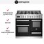 Устройства с тремя духовками также имеют один основной и две дополнительных шкафа разного объема: например, плиты Bertazzoni оснащены большой духовкой объемом 69 литров, средней объемом 54 литра и малой объемом 24 литра. Духовки располагаются в два ряда: две меньшие духовки в одном ряду, большая и ящик для посуды в другом.