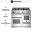 Устройства с тремя духовками также имеют один основной и две дополнительных шкафа разного объема: например, плиты Bertazzoni оснащены большой духовкой объемом 69 литров, средней объемом 54 литра и малой объемом 24 литра. Духовки располагаются в два ряда: две меньшие духовки в одном ряду, большая и ящик для посуды в другом.