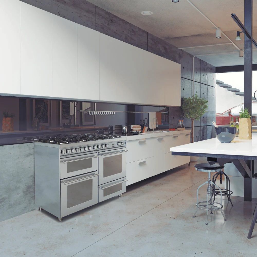 Устройства с тремя духовками также имеют один основной и две дополнительных шкафа разного объема: например, плиты Bertazzoni оснащены большой духовкой объемом 69 литров, средней объемом 54 литра и малой объемом 24 литра. Духовки располагаются в два ряда: две меньшие духовки в одном ряду, большая и ящик для посуды в другом.