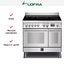 Устройства с тремя духовками также имеют один основной и две дополнительных шкафа разного объема: например, плиты Bertazzoni оснащены большой духовкой объемом 69 литров, средней объемом 54 литра и малой объемом 24 литра. Духовки располагаются в два ряда: две меньшие духовки в одном ряду, большая и ящик для посуды в другом.