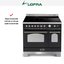 Устройства с тремя духовками также имеют один основной и две дополнительных шкафа разного объема: например, плиты Bertazzoni оснащены большой духовкой объемом 69 литров, средней объемом 54 литра и малой объемом 24 литра. Духовки располагаются в два ряда: две меньшие духовки в одном ряду, большая и ящик для посуды в другом.