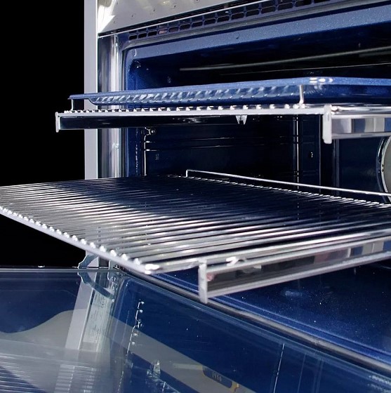 Устройства с тремя духовками также имеют один основной и две дополнительных шкафа разного объема: например, плиты Bertazzoni оснащены большой духовкой объемом 69 литров, средней объемом 54 литра и малой объемом 24 литра. Духовки располагаются в два ряда: две меньшие духовки в одном ряду, большая и ящик для посуды в другом.