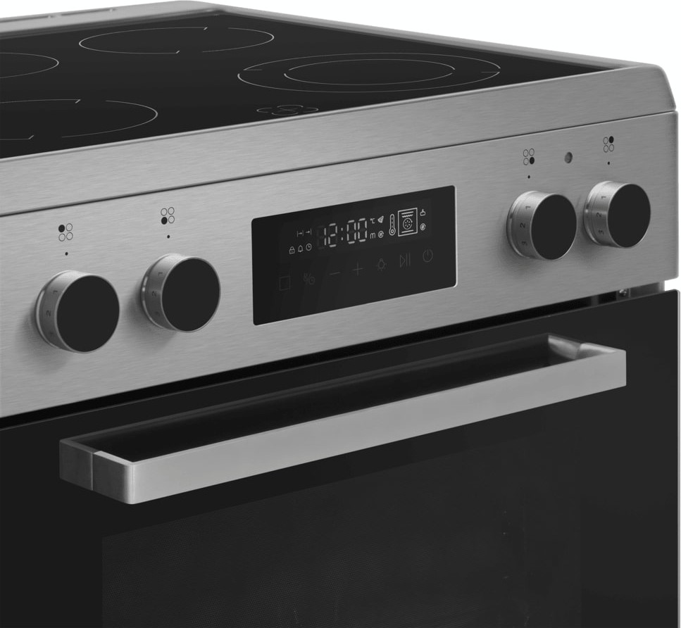В данной модели установлена электрическая варочная поверхность — эффективный нагрев, специальные механизмы для защиты вас от ожогов, плавная регулировка мощности. Стандартное количество конфорок — 4 штуки — подходит большинству пользователей. Панель выполнена из прочной стеклокерамики, которая обеспечивает надежность и долгий срок службы; за ней необходимо тщательно ухаживать. В вашем распоряжении особые зоны нагрева: Hi-Light. Используйте их для воплощения в жизнь сложных или необычных рецептов. Вы можете контролировать и менять силу жара конфорок на панели управления, количество ступеней в этой модели: 9.