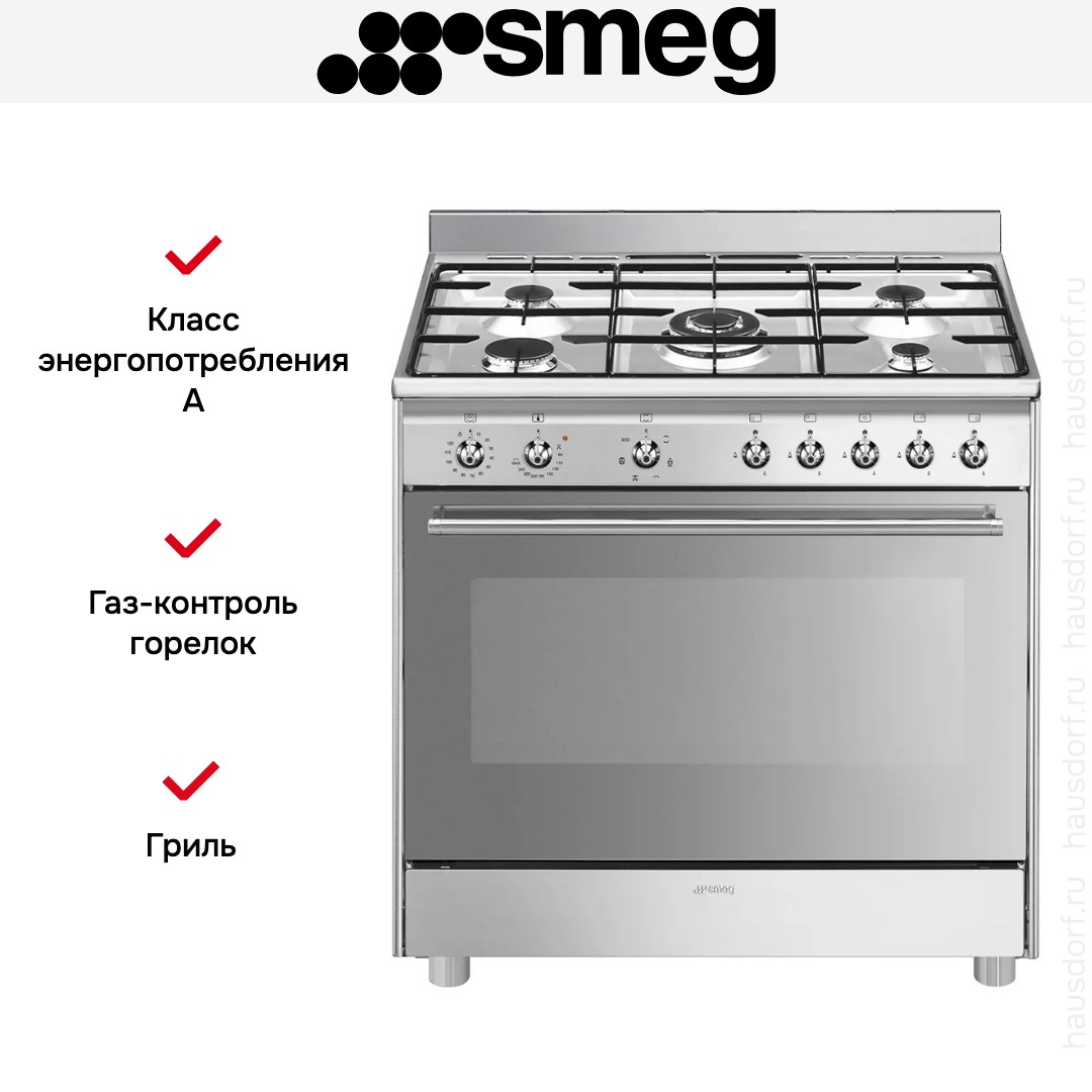 Комбинированная плита Smeg SX91GM — отличный выбор как для квартиры, так и для частного дома. Цвет корпуса нержавеющая сталь, он гармонично сочетается с мебелью и техникой похожих оттенков, а также может интересно выглядеть на контрасте с ними. Для управления используется удобная и понятная механическая система. Благодаря ей выбирать режимы приготовления и настраивать параметры температуры очень просто. Переключатели не только выполняют техническую функцию, но и поддерживают общий дизайн; тип элементов: поворотные.