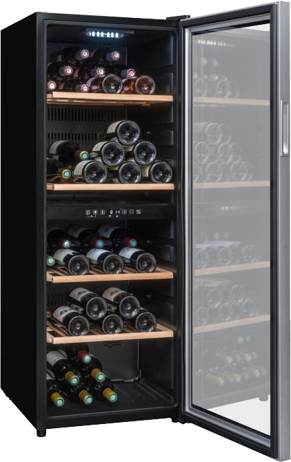 Внутренняя организация ориентирована на удобство доступа и бережное хранение. Четыре деревянные полки с направляющими выдвигаются для аккуратной выкладки бутылок и минимизируют вибрации, что важно для осадочных вин. Общая вместимость до 91 бутылки 0,75 л достигается за счёт рациональной компоновки, несмотря на общий объём 68 литров. Защитное стекло с УФ‑фильтром предотвращает выгорание этикеток и преждевременное старение напитков, а мягкая светодиодная подсветка освещает содержимое без нагрева. Сенсорное управление с цифровым дисплеем позволяет точно задавать температуру и отслеживать текущие значения одним касанием.