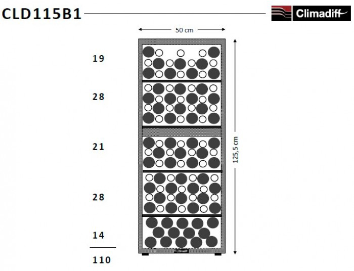 Производители предлагают винные шкафы, оснащенные одной, двумя, тремя и четырьмя камерами, которые могут располагаться как друг под другом, так бок и бок. Самые популярные — однокамерные модели, ассортимент которых особенно широк, но втором месте — двухкамерные. Над заметить, что количество камер не зависит напрямую от габаритов изделия: например, однокамерные модели увеличенных габаритов — далеко не редкость. Их высота может варьироваться в пределах от 14 см до 219 см, а ширина — от 13 см до 150 см.