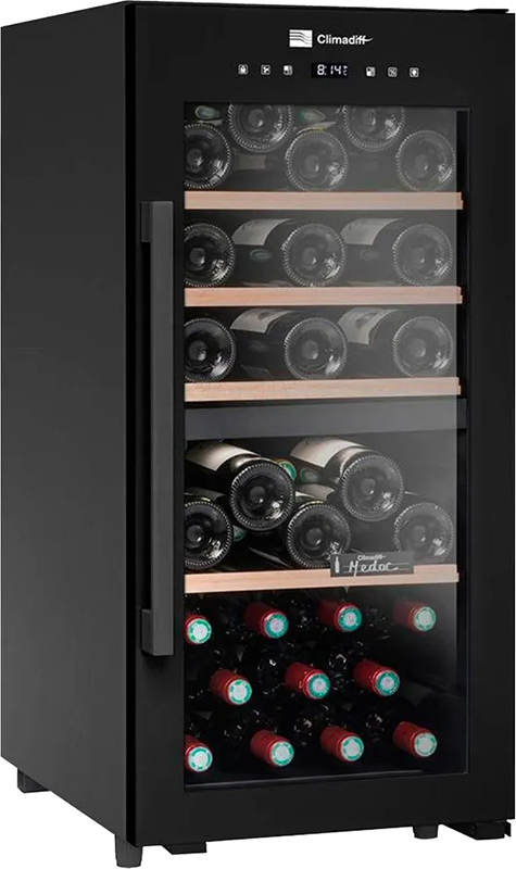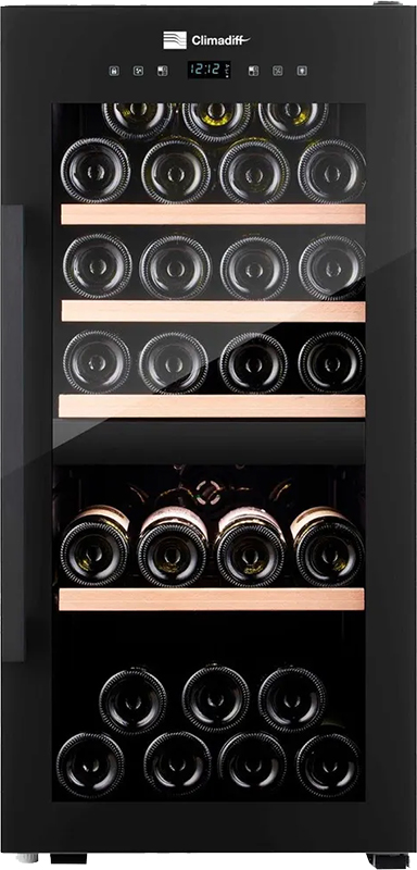 Винный холодильник Climadiff CLD40B1 имеет две температурные зоны, в которых одновременно можно хранить разные сорта алкоголя и выставлять разные сочетания настроек. Он устанавливается отдельно, что удобно, если у вас есть специальное помещение — кладовая, погреб и т.д. Благодаря компактным размерам данная модель — отличный выбор для офиса, гостиничного номера. Количество бутылок, которое можно разместить с учетом полной комплектации и из расчета объема бутылки 0,75 л, — 41 шт.