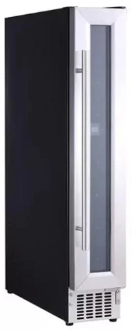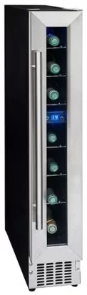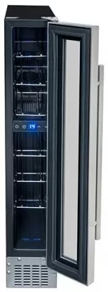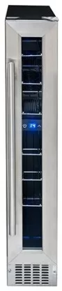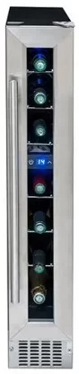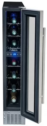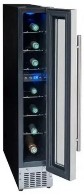 Винный шкаф вмещает до 7 бутылок, предназначен для подготовки к подаче на стол. Его можно установить отдельно и встроить под столешницу благодаря ширине 15 см. В камере один режим, минимальная температура — на 14 градусов ниже, чем в комнате.