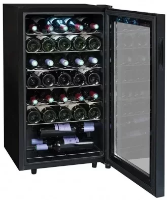 Дверца у большинства винных шкафов изготавливается из многослойного тонированного стекла. Такой материал, с одной стороны, позволяет оценивать коллекцию вин визуально, не открывая дверцу, в условиях стабильной температуры и влажности. С другой стороны, затемненное стекло с УФ-фильтром в виде напыления или специальной пленки надежно изолирует винные бутылки негативного воздействия ультрафиолетового излучения. Несколько слоев стекла обеспечивают при этом дополнительную защиту. Очень часто стекло в дверце заключается в рамку из дерева или металла. Натуральный или окрашенный металл или дерево не только способствуют прочности конструкции, но и превращают винный холодильник, особенно отдельно стоящий, в эффектный элемент обстановки.