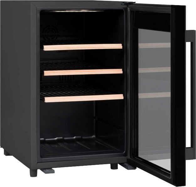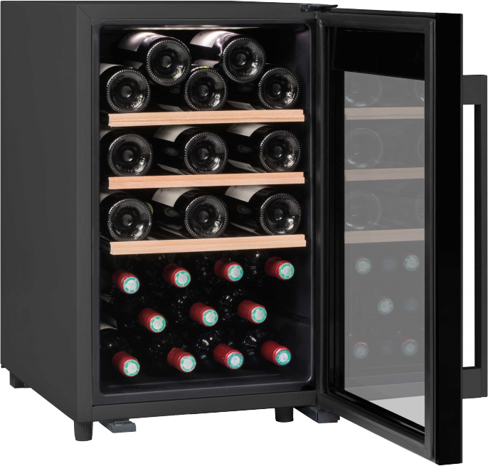 Стеклянная дверь — дополнительный изящный штрих к общему дизайну модели. Специальное покрытие защищает вино от влияния ультрафиолетовых лучей, которые проникают, если шкаф находится в солнечной комнате. Цвет корпуса — черный.