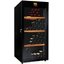 Производители предлагают винные шкафы, оснащенные одной, двумя, тремя и четырьмя камерами, которые могут располагаться как друг под другом, так бок и бок. Самые популярные — однокамерные модели, ассортимент которых особенно широк, но втором месте — двухкамерные. Над заметить, что количество камер не зависит напрямую от габаритов изделия: например, однокамерные модели увеличенных габаритов — далеко не редкость. Их высота может варьироваться в пределах от 14 см до 219 см, а ширина — от 13 см до 150 см.