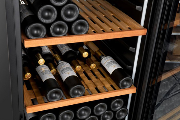 Полки в винных шкафах позволяют размещать бутылки для хранения в горизонтальном положении. Это необходимо, чтобы пробка постоянно смачивалась жидкостью и не пересыхала. Плотно закрытая пробка гарантирует, что внутрь бутылки не проникнет наружный воздух. Кислород, содержащийся в воздухе, может стать причиной ухудшения вкуса вина и даже его скисания. Кроме того, горизонтальное положение позволяет лучше оценить количество осадка. Материал изготовления полок выбирается, исходя из требований, предъявляемых к содержанию коллекции вин. Одним из основных требования является отсутствие или максимальное сокращение вибрации и хорошая фиксация бутылок на месте хранения. Даже если полка выдвигается, бутылки должны оставаться на своем месте. Второе требование исключает применение стеклянных полок, как в обычном холодильнике: на них почти невозможно зафиксировать бутылки.