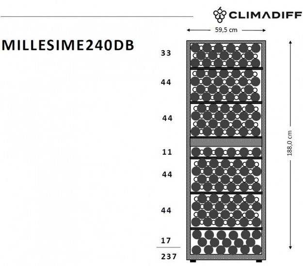 Винный холодильник Climadiff MILLESIME240DB имеет две температурные зоны, в которых одновременно можно хранить разные сорта алкоголя и выставлять разные сочетания настроек. Он устанавливается отдельно, что удобно, если у вас есть специальное помещение — кладовая, погреб и т.д. Количество бутылок, которое можно разместить с учетом полной комплектации и из расчета объема бутылки 0,75 л, — 237 шт.