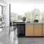 Встраиваемые холодильники для вина оснащаются специальной системой вентиляции: охлаждающая система у них находится в нижней части корпуса спереди. На такие устройства не навешивается мебельный фасад: дверца с затемненным стеклом остается на виду и открывается на достаточно широкий угол для свободного выдвижения деревянных полок.