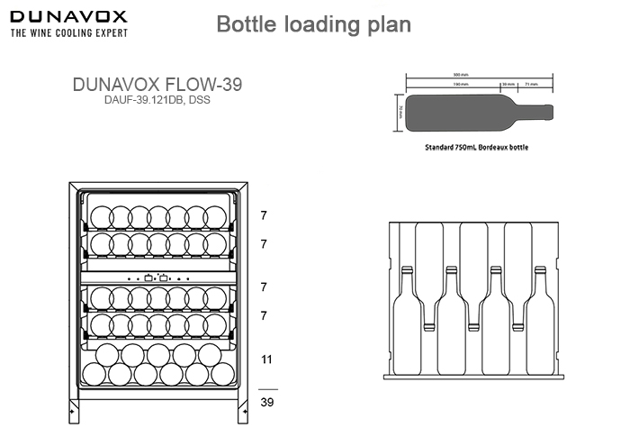 Винный холодильник Dunavox DAUF-39.121DC имеет две температурные зоны, в которых одновременно можно хранить разные сорта алкоголя и выставлять разные сочетания настроек. Он встраивается в нишу, что удобно, если у вас ограничен метраж помещения. Благодаря компактным размерам данная модель — отличный выбор для офиса, гостиничного номера. Количество бутылок, которое можно разместить с учетом полной комплектации и из расчета объема бутылки 0,75 л, — 39 шт.