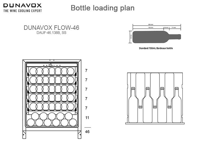 Стандартная вместительность рассчитывается по количеству бутылок «Бордо» 0,75 л. Это число также показывает максимальную загрузку при полной комплектации (полок, ящиков и других элементов).