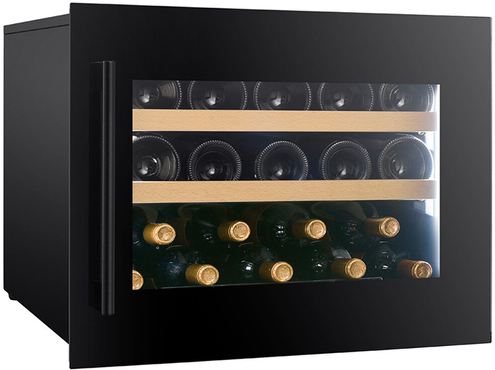 Стеклянная дверь — дополнительный изящный штрих к общему дизайну модели. Специальное покрытие защищает вино от влияния ультрафиолетовых лучей, которые проникают, если шкаф находится в солнечной комнате. Хранение становится еще безопаснее и герметичнее благодаря нескольким слоям стекол. Цвет корпуса — черный матовый. Дверь можно перевесить на другую сторону, поэтому вариантов размещения его в доме становится больше.