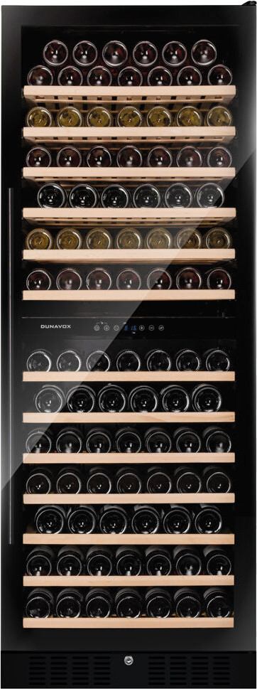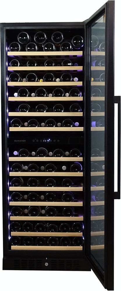 Винный холодильник Dunavox DX-108.330DMB имеет две температурные зоны, в которых одновременно можно хранить разные сорта алкоголя и выставлять разные сочетания настроек. Он устанавливается отдельно, что удобно, если у вас есть специальное помещение — кладовая, погреб и т.д. Количество бутылок, которое можно разместить с учетом полной комплектации и из расчета объема бутылки 0,75 л, — 108 шт.