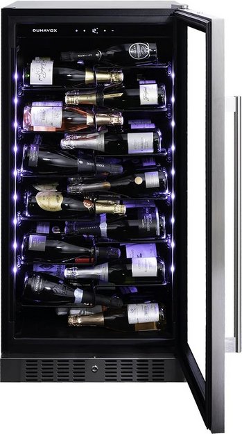 Винный холодильник Dunavox DX-70.258C имеет одну температурную зону, в которой можно разместить бутылки и единовременно выставить только одну комбинацию настроек. Он устанавливается отдельно, что удобно, если у вас есть специальное помещение — кладовая, погреб и т.д. Количество бутылок, которое можно разместить с учетом полной комплектации и из расчета объема бутылки 0,75 л, — 70 шт.