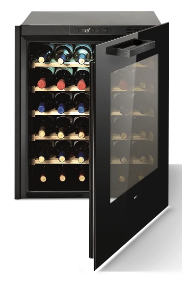 Стеклянная дверь — дополнительный изящный штрих к общему дизайну модели. Специальное покрытие защищает вино от влияния ультрафиолетовых лучей, которые проникают, если шкаф находится в солнечной комнате. Хранение становится еще безопаснее и герметичнее благодаря нескольким слоям стекол. Цвет корпуса — черный.
