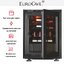 Управление сенсорное, панель снабжена дисплеем, что упрощает точную установку температуры и отслеживание состояния. Дверь со стеклопакетом в чёрной рамке выглядит элегантно и позволяет демонстрировать коллекцию, не открывая прибор. Наличие двух выдвижных полок, одного ½ поддона и ящика делает размещение бутылок удобным и аккуратным.