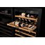 Встраиваемые холодильники для вина оснащаются специальной системой вентиляции: охлаждающая система у них находится в нижней части корпуса спереди. На такие устройства не навешивается мебельный фасад: дверца с затемненным стеклом остается на виду и открывается на достаточно широкий угол для свободного выдвижения деревянных полок.