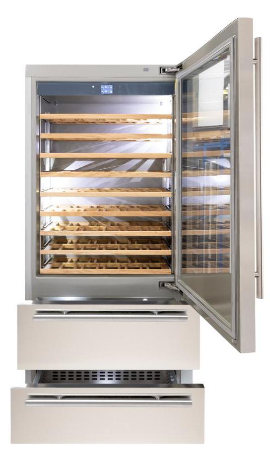 Винный холодильник Fhiaba KS900HWT6 имеет две температурные зоны, в которых одновременно можно хранить разные сорта алкоголя и выставлять разные сочетания настроек. Он встраивается в нишу, что удобно, если у вас ограничен метраж помещения. Количество бутылок, которое можно разместить с учетом полной комплектации и из расчета объема бутылки 0,75 л, — 108 шт.