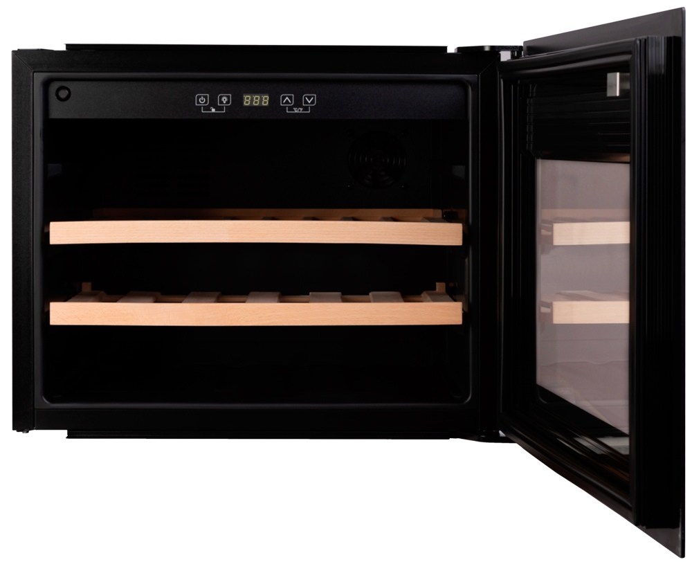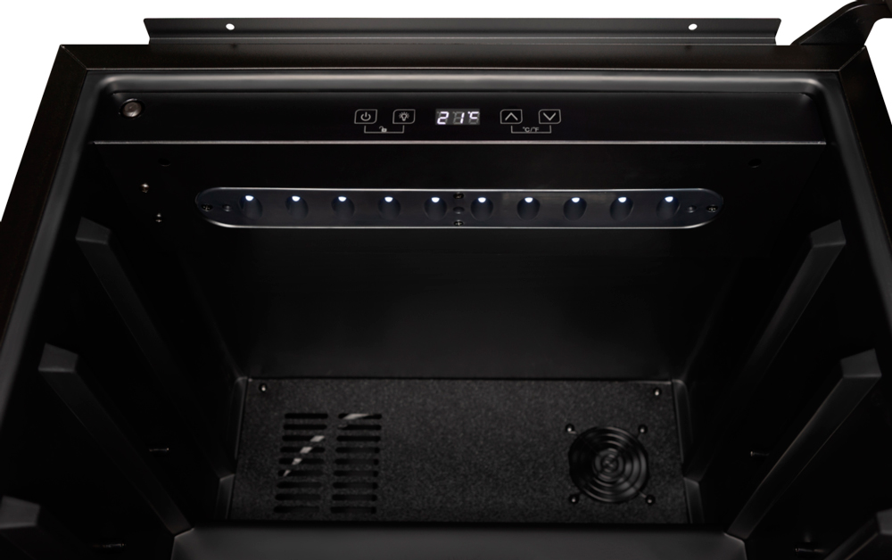 Электронное управление помогает быстро разобраться в том, как функционирует эта модель, и легко настроить все необходимые параметры. На дисплее отображаются данные, которые собирают датчики в камере. Лампочки, расположенные внутри, хорошо подсвечивают бутылки. Всего полок, на которых можно разместить коллекцию, в шкафу 2 шт.