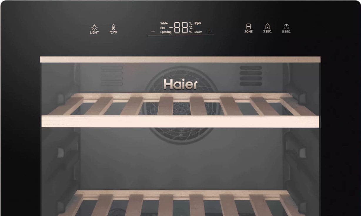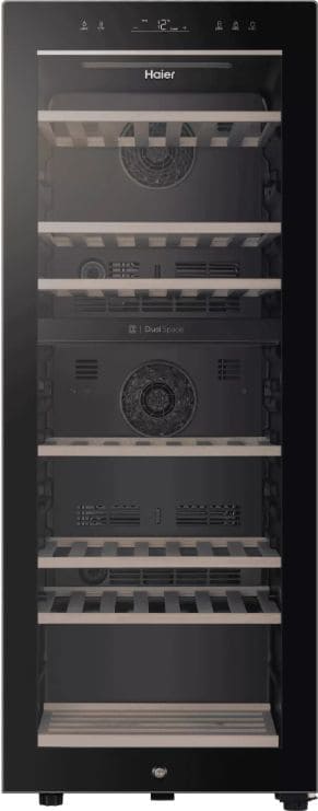 Винный холодильник Haier FWC77GDAU1 имеет две температурные зоны, в которых одновременно можно хранить разные сорта алкоголя и выставлять разные сочетания настроек. Он устанавливается отдельно, что удобно, если у вас есть специальное помещение — кладовая, погреб и т.д. Количество бутылок, которое можно разместить с учетом полной комплектации и из расчета объема бутылки 0,75 л, — 77 шт.
