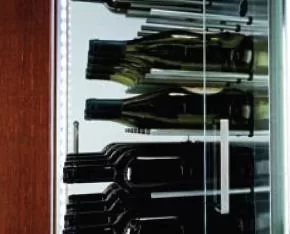 Дверца у большинства винных шкафов изготавливается из многослойного тонированного стекла. Такой материал, с одной стороны, позволяет оценивать коллекцию вин визуально, не открывая дверцу, в условиях стабильной температуры и влажности. С другой стороны, затемненное стекло с УФ-фильтром в виде напыления или специальной пленки надежно изолирует винные бутылки негативного воздействия ультрафиолетового излучения. Несколько слоев стекла обеспечивают при этом дополнительную защиту. Очень часто стекло в дверце заключается в рамку из дерева или металла. Натуральный или окрашенный металл или дерево не только способствуют прочности конструкции, но и превращают винный холодильник, особенно отдельно стоящий, в эффектный элемент обстановки.