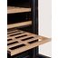 Полки в винных шкафах позволяют размещать бутылки для хранения в горизонтальном положении. Это необходимо, чтобы пробка постоянно смачивалась жидкостью и не пересыхала. Плотно закрытая пробка гарантирует, что внутрь бутылки не проникнет наружный воздух. Кислород, содержащийся в воздухе, может стать причиной ухудшения вкуса вина и даже его скисания. Кроме того, горизонтальное положение позволяет лучше оценить количество осадка. Материал изготовления полок выбирается, исходя из требований, предъявляемых к содержанию коллекции вин. Одним из основных требования является отсутствие или максимальное сокращение вибрации и хорошая фиксация бутылок на месте хранения. Даже если полка выдвигается, бутылки должны оставаться на своем месте. Второе требование исключает применение стеклянных полок, как в обычном холодильнике: на них почти невозможно зафиксировать бутылки.