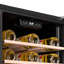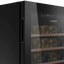 Внутреннее пространство организовано под хранение и выдержку: полезный объём 124 л вмещает до 56 стандартных бутылок 0,75 л. Пять полок из бука не только эстетично выглядят, но и гасит вибрации, предотвращая беспокойство осадка в вине. Деревянные поверхности мягче относятся к горлышкам бутылок, а их конфигурация позволяет менять расстановку для бутылок разного размера. Встроенная LED-подсветка равномерно освещает содержимое и не нагревает его.