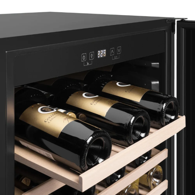 Стеклянная дверь — дополнительный изящный штрих к общему дизайну модели. Специальное покрытие защищает вино от влияния ультрафиолетовых лучей, которые проникают, если шкаф находится в солнечной комнате. Цвет корпуса — черный.