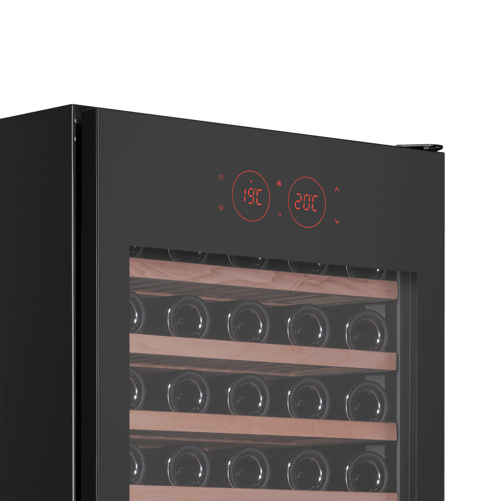 Стеклянная дверь — дополнительный изящный штрих к общему дизайну модели. Специальное покрытие защищает вино от влияния ультрафиолетовых лучей, которые проникают, если шкаф находится в солнечной комнате. Цвет корпуса — черный.